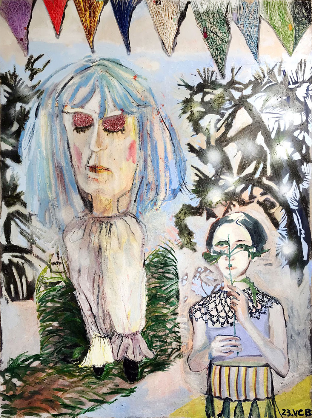Mathieu—2024—116x90cm—oil paint, aerosol, glitter, marble powder, pastel and mercerized cotton embroidered on canvas